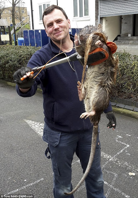 The rodent dubbed "the hackney rat"(pictured below) was found by gas engineer Tony Smith who photographed his electrician pal James holding the carcass in a litter picker. They were, from what I can tell from most versions of the story, the only two who saw it. Tony has also neatly copyrighted the photo. No wonder James is smiling.